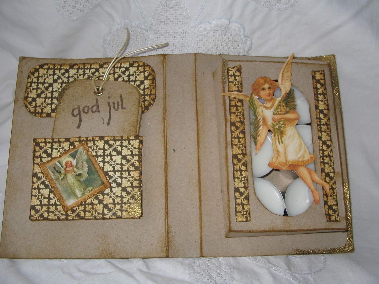 Inden i bogen har jeg lavet 2 rum, en på hver sidde. den til v har jeg lavet så den også kan bruges til tag. Jeg har pyntet med blonder, embossing og et nyt stempel som jeg også lige fik købt på SMA.